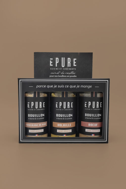Des concentrés de veau, de volaille et de bœuf en poudre ! Le traditionnel bouillon de volaille se transmet de génération en génération et aujourd’hui, Épure tient vous faire (re)découvrir les saveurs d’origines de ce mythique bouillon sans additif. Et pour davantage de plaisir gustatif, ÉPURE à recréer un bouillon de veau ainsi que le bouillon de bœuf, pas de jaloux !